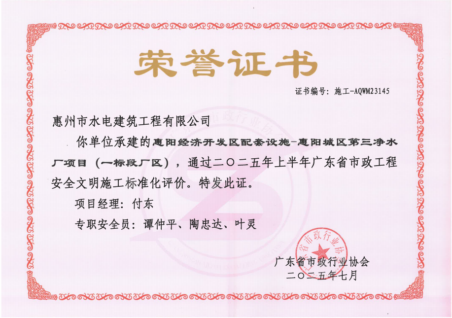 惠州市水電建筑工程有限公司成立于一九六四年四月,隸屬惠州市水務(wù)集團(tuán)有限公司,是一家國有綜合性施工企業(yè),主營水利水電工程、房屋建筑、市政工程等施工業(yè)務(wù)。公司擁有水利水電工程施工總承包一級、建筑工程施工總承包一級、市政公用工程施工總承包一級、公路工程施工總承包三級,公路路基、路面及建筑裝修裝飾專業(yè)承包二級,環(huán)保工程、機電安裝、河湖整治、輸變電工程專業(yè)承包三級等經(jīng)營資質(zhì)……